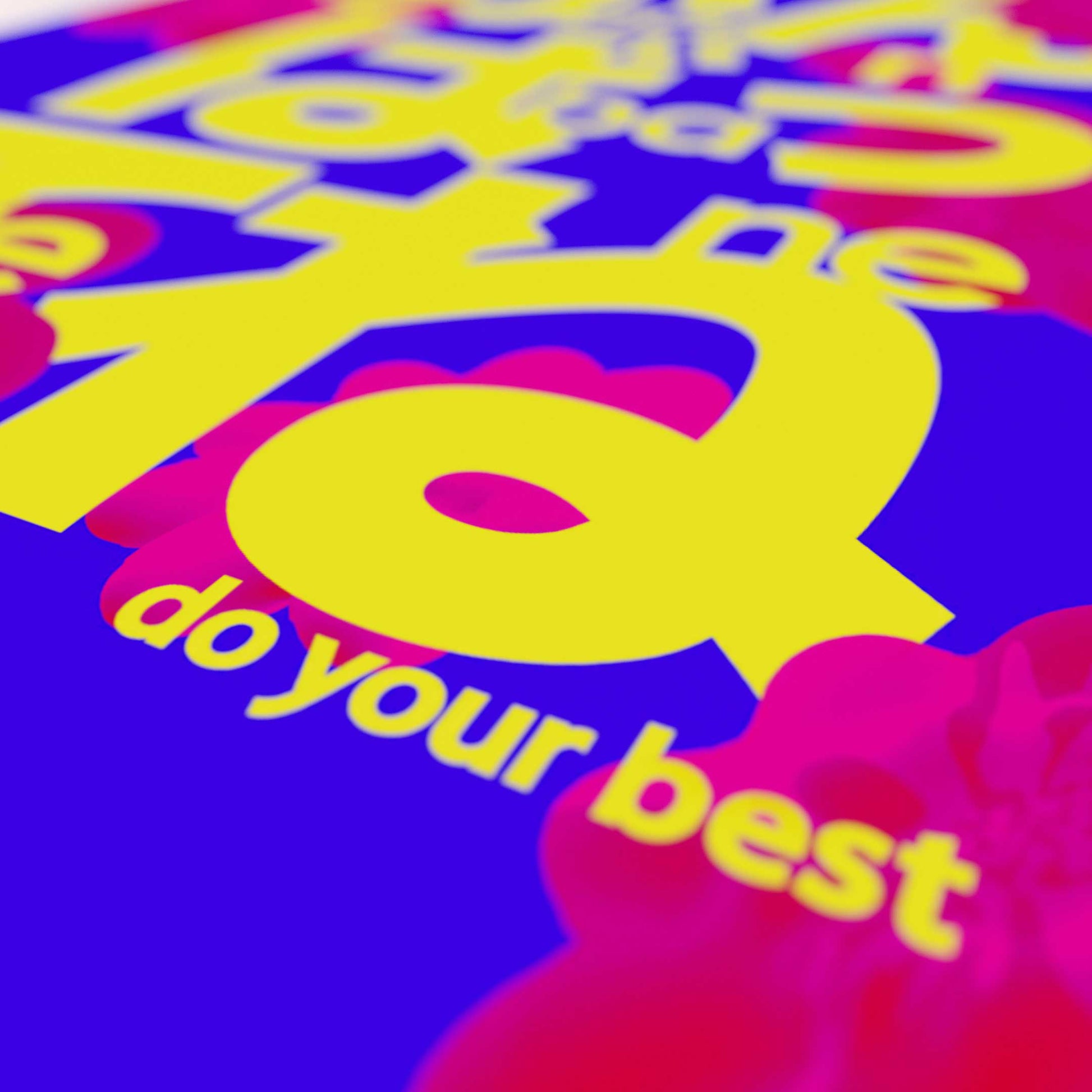 Pink flowers with yellow type on a dark blue background. This popular Japanese phrase GaNBaTeNe! resonates with us 'Do your best' and keep going!