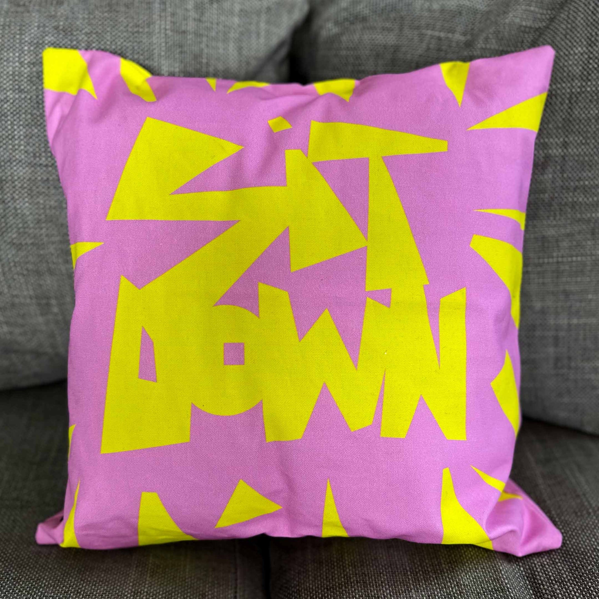 Sit Down Pint Yellow hand-drawn sketched cushion on both sides.